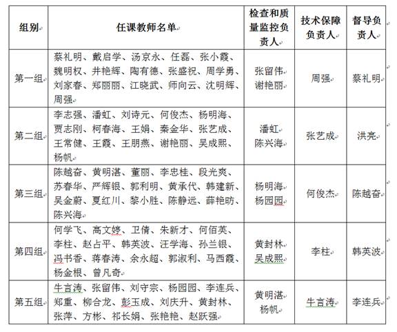 为了强化对线上课程的教学检查和质量监控,按照任课教师名单分别成立五个组,每组安排专人进行负责,建立“一督双查一保障”模式,具体安排见下表: