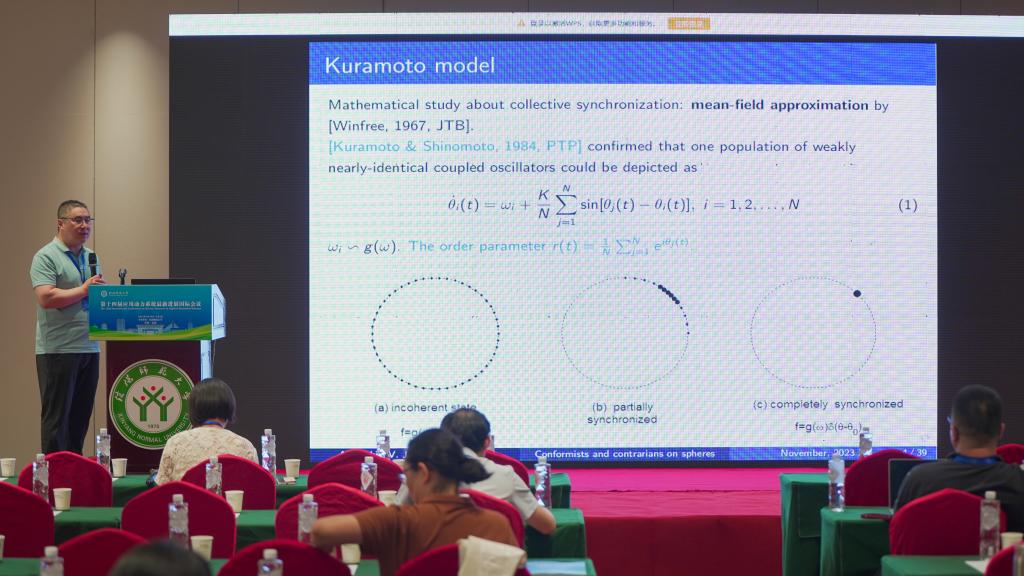 哈尔滨工业大学(威海)的牛犇,做了题目为《Conformists–contrarians model of identical Kuramoto oscillators on a sphere》的报告。