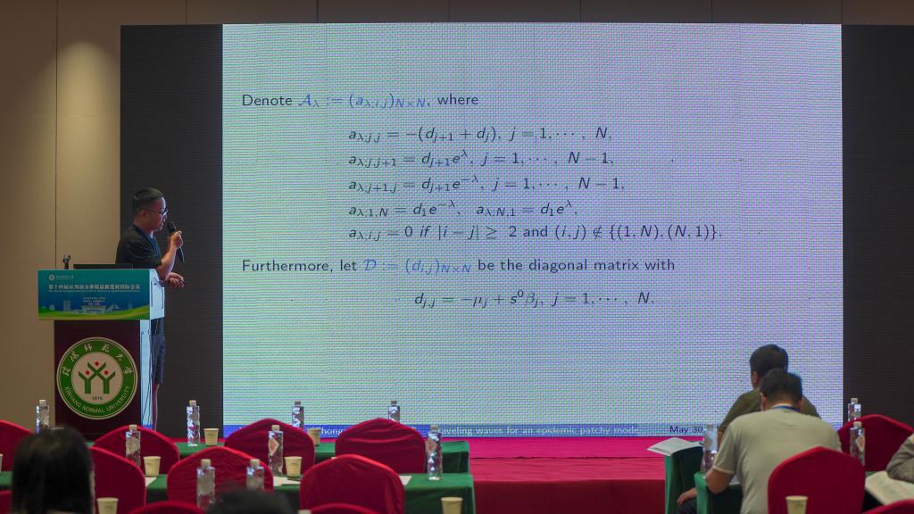 重庆大学的散雪峰,做了题目为《Traveling waves for an epidemic patchy model with bilinear incidence》的报告。