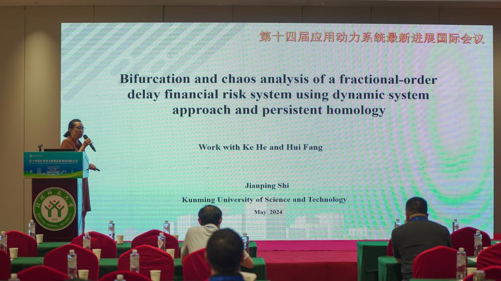 昆明理工大学的石剑平,做了题目为《Bifurcation and chaos analysis of a fractional-order delay financial risk system using dynamic system approach and persistent homology》的报告。