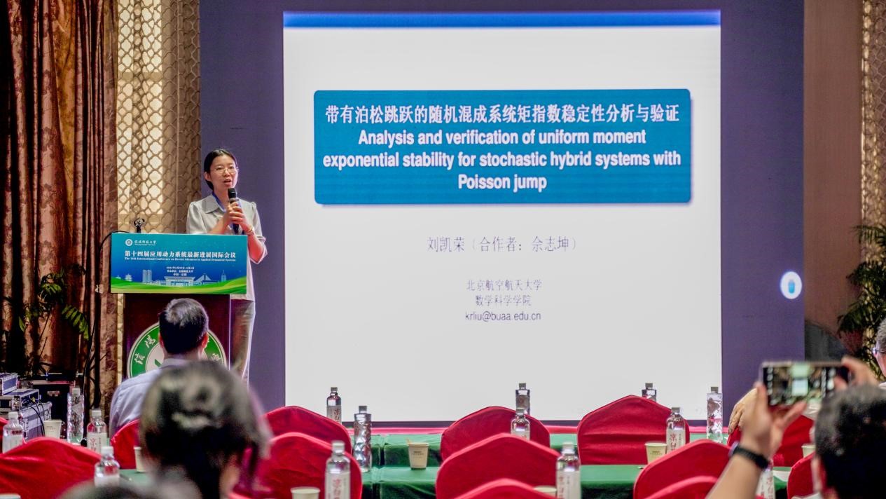 北京航空航天大学的刘凯荣,做了题目为《Analysis and verification of uniform moment exponential stability for stochastic hybrid systems with Poisson jump》的报告。