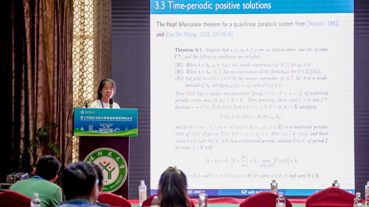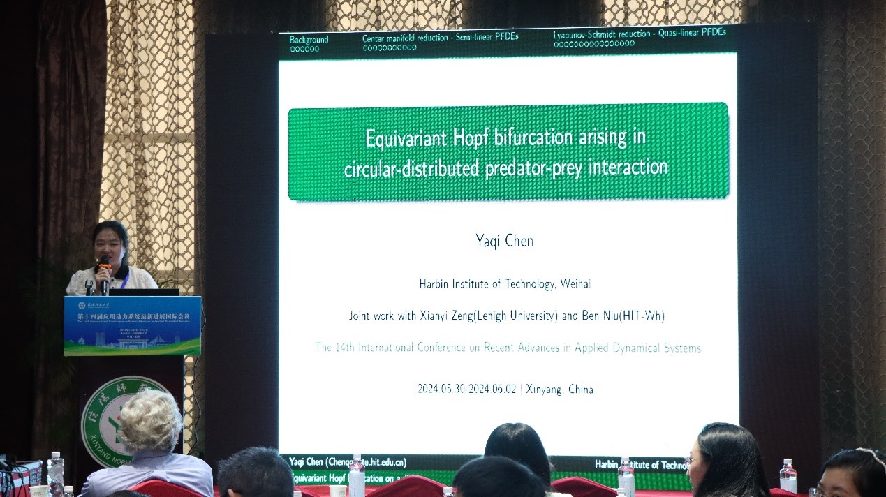 哈尔滨工业大学(威海)的陈雅琪,做了题目为《Equivariant Hopf bifurcation arising in circular-distributed predator-prey interaction》的报告。