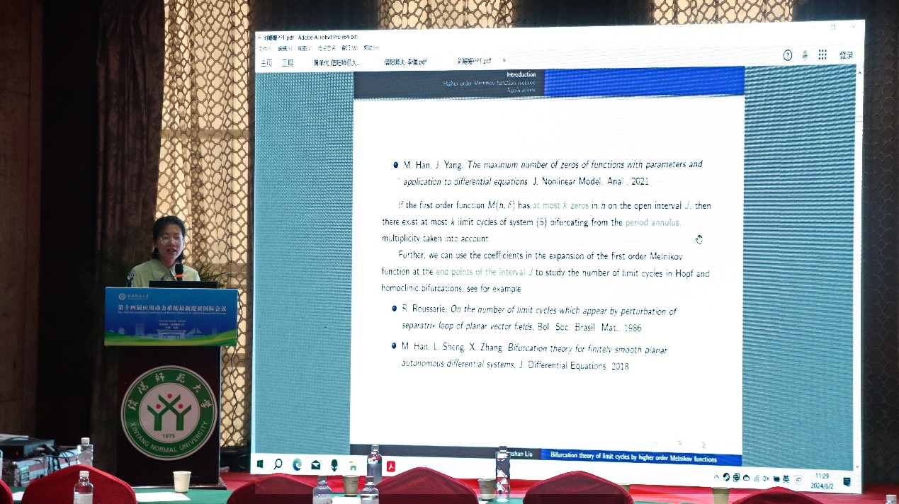 浙江师范大学的刘姗姗,做了题目为《极限环分支的高阶Melnikov函数方法》的报告。