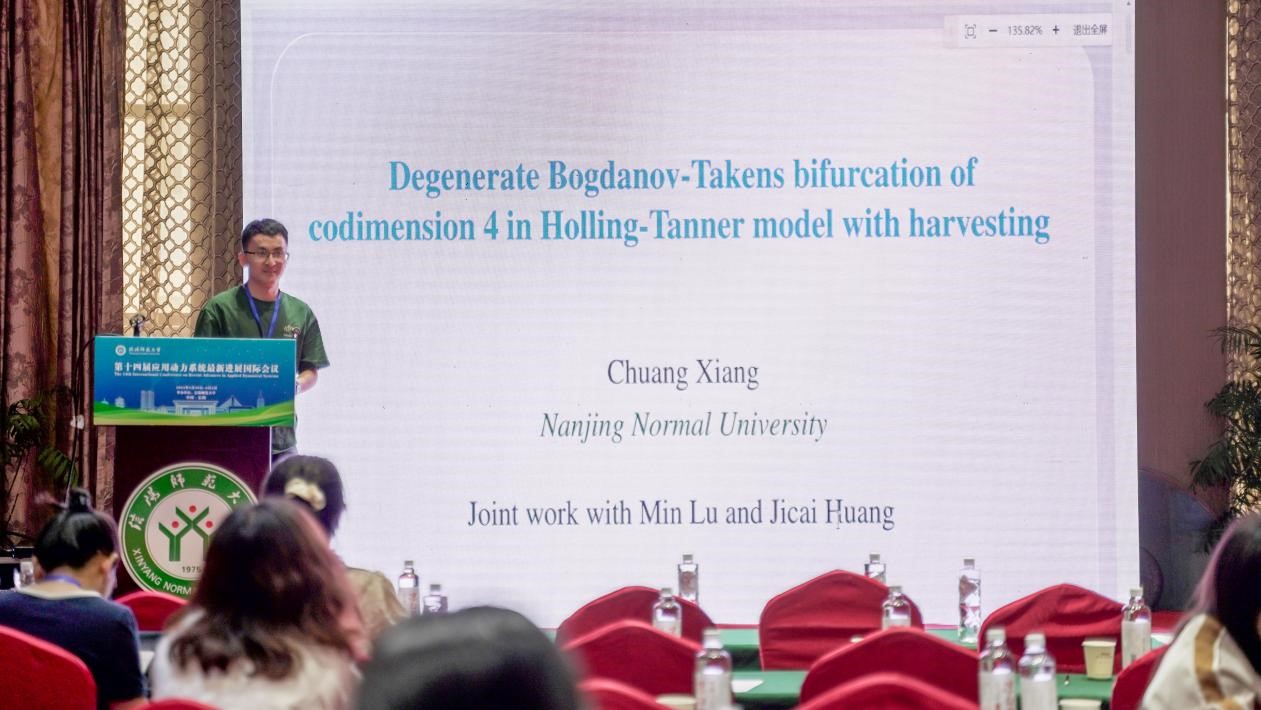 南京师范大学的向创,做了题目为《 Degenerate Bogdanov-Takens bifurcation of codimension 4 in Holling-Tanner model with harvesting》的报告。