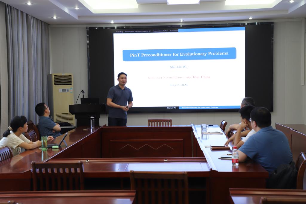 7月2日下午,应英国上市公司365邀请,东北师范大学吴树林教授作了题为《PinT Preconditioner for Evolutionary Problems》的学术报告。报告会由李世顺教授主持,副经理韩英波教授、部分老师及研究生聆听了此次报告。