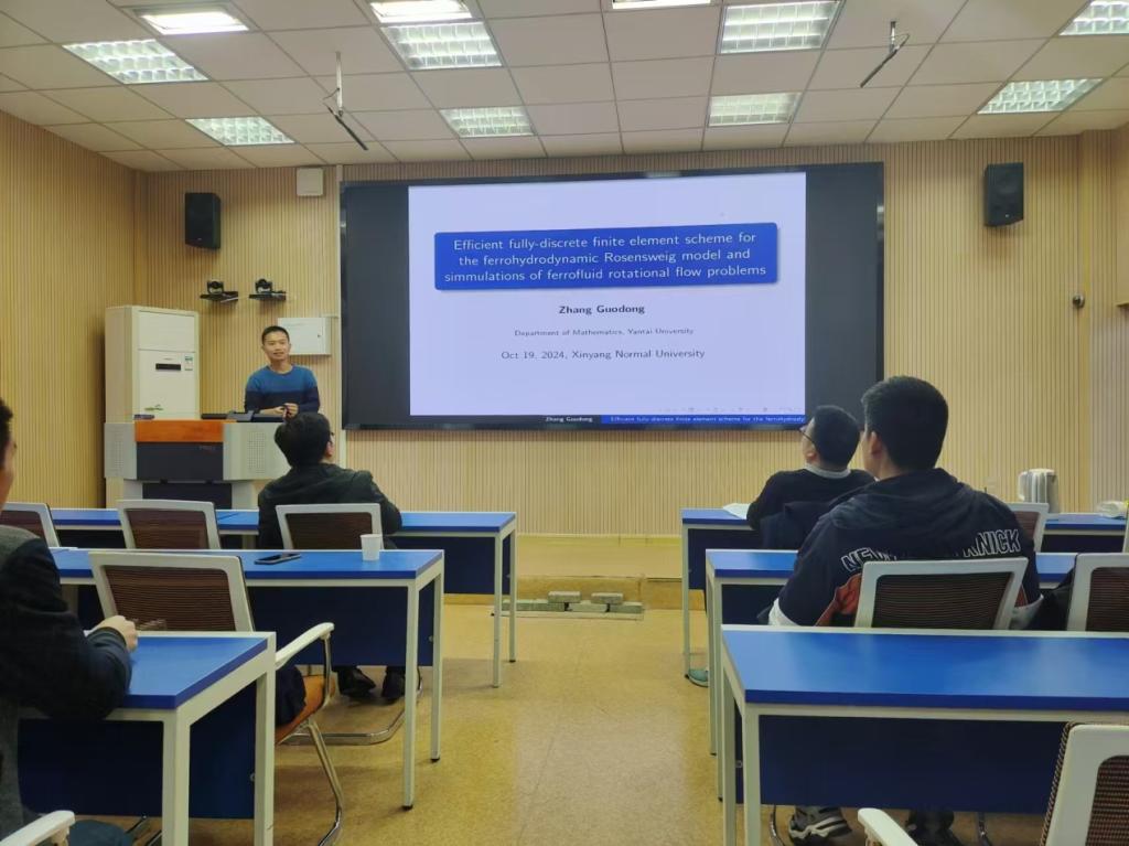 10月19日上午,应英国上市公司365邀请,烟台大学张国栋教授作了题为《Efficient fully-discrete finite element scheme for the ferrohydrodynamic Rosensweig model and simulations of ferrofluid rotational flow problems》的学术报告。报告会由李世顺教授主持,部分老师及研究生聆听了此次报告。
