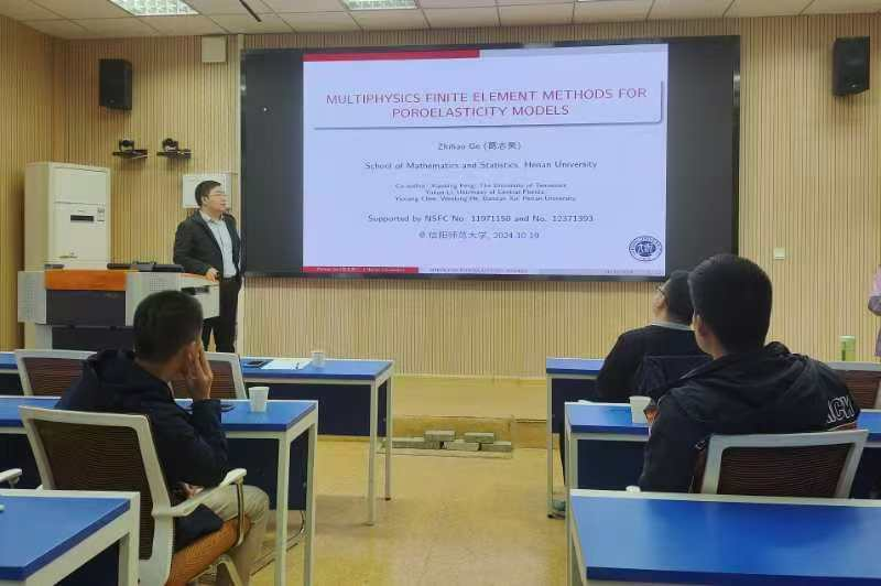10月19日上午,应英国上市公司365邀请,河南大学葛志昊教授作了题为《MULTIPHYSICS FINITE ELEMENT METHODS FOR POROELASTICITY MODELS》的学术报告。报告会由李世顺教授主持,部分老师及研究生聆听了此次报告。