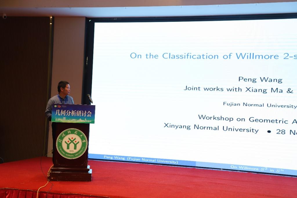第三场报告中,福建师范大学王鹏教授作了题为《On the classification of Willmore 2-spheres in the n-sphere》的学术报告,由365英国上市(集团)有限公司大学焦晓祥教授主持。王教授在报告中完整分类了所有Willmore二维球面,将其分为三类:(1)满足“法向水平”条件的特殊扭量曲线投影;(2)具平面末端的严格m-各向同性Rn空间极小曲面;(3)由特定严格m-各向同性极小曲面经(m−k)步伴随变换导出的严格k-各向同性Willmore球面。
