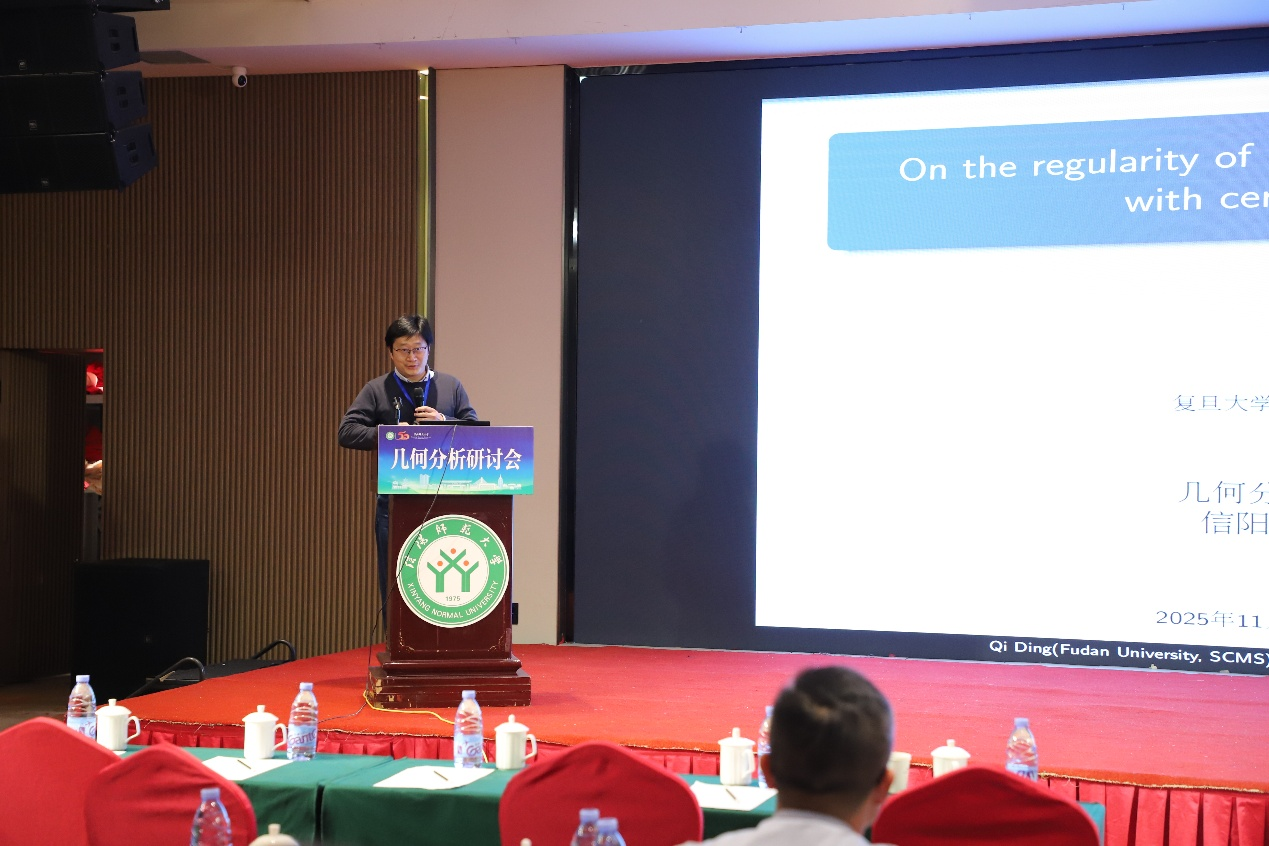第四场报告由复旦大学丁琪教授主讲,题目为《On the regularity of Lagrangian submanifolds with certain phases》。本场报告由南昌大学黎镇琦教授主持。丁教授系统介绍了拉格朗日子流形的几何与分析理论,重点讨论了具有恒定相位、利普希茨连续相位及调和相位的拉格朗日子流形的正则性性质。