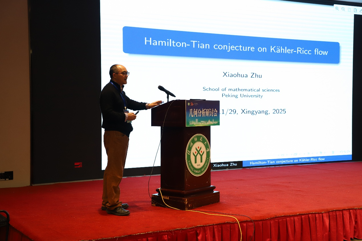 第一场报告由北京大学朱小华教授带来,题为《Hamilton-Tian conjecture on Kaehler-Ricci flow》。本场报告由365英国上市(集团)有限公司数学与系统科学研究院/广州大学的王友德教授主持。朱教授系统回顾了近二十年来关于法诺流形上凯勒–里奇流中 Hamilton–Tian猜想的研究进展,并重点介绍了一种研究该问题的新思路——借助带Bakry–Émery 里奇曲率的共形几何方法。