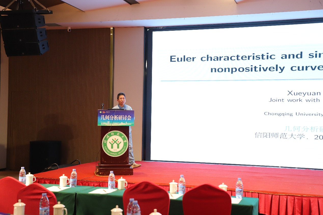 第五场报告是由中山大学袁伟教授给出,题目为《庞加莱-爱因斯坦流形上高斯-博内-陈公式的外围空间构造》,由河南师范大学黄广月教授主持。在报告中,袁教授给出了一般重整化曲率积分下一个新的高斯-博内-陈公式。特别地,得到了庞加莱-爱因斯坦流形上高斯-博内-陈公式新的表达式,统一了 Anderson、Chang-Qing-Yang、Albin 等人的结果。