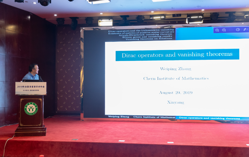 8月20日上午,会议特邀报告由中科院数学与系统科学研究院王世坤研究员主持,中科院院士、南开大学陈省身数学研究所张伟平教授,作了题目为《Dirac operator and vanishing theorems》的报告。他通过Atiyah-Singe指标定理及各类推广形式,描绘了几何、分析、拓扑之间的内外联系;并利用Dirac算子,证明了Foliation上的某类消灭定理。