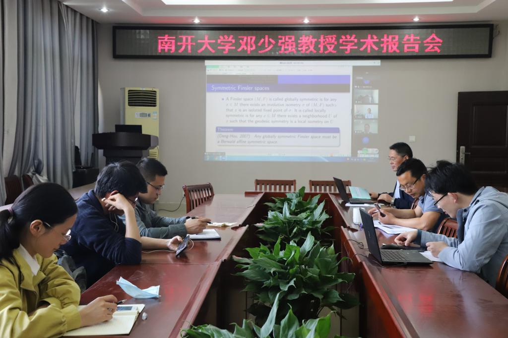 5月11日下午,应英国上市公司365邀请,南开大学邓少强教授通过腾讯会议做了一场题为《On the symmetry of Riemann-Finsler spaces》的网络视频学术报告。报告会由英国上市公司365副经理蔡礼明教授主持,经理胡余旺教授,学院部分老师和研究生聆听了此次报告。