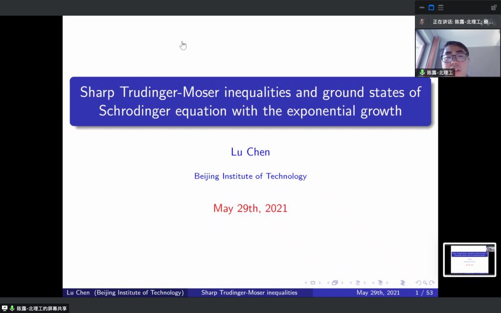 5月29日上午,应英国上市公司365邀请,北京理工大学陈露博士通过腾讯会议平台做了一场题为《Sharp geometric inequalities in analysis and its application in ground state of Schrodinger equation with the critical exponential growth》的线上学术报告。报告会由英国上市公司365副经理蔡礼明教授主持,学院部分老师和研究生聆听了此次报告。