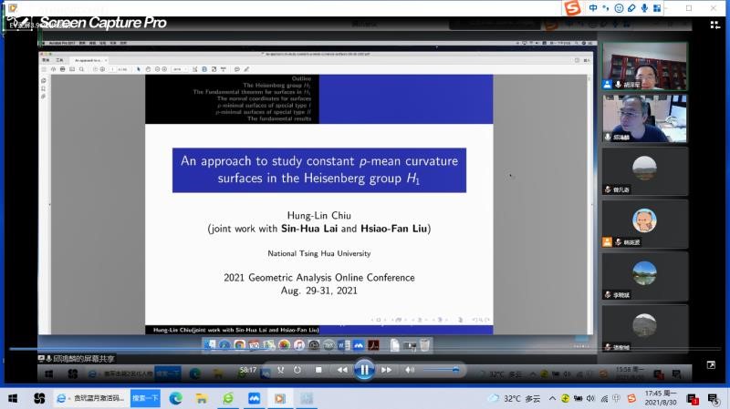 第2场报告由台湾清华大学邱鸿麟教授报告,题目为《An approach to study constant p-mean curvature surfaces in the Heisenberg group