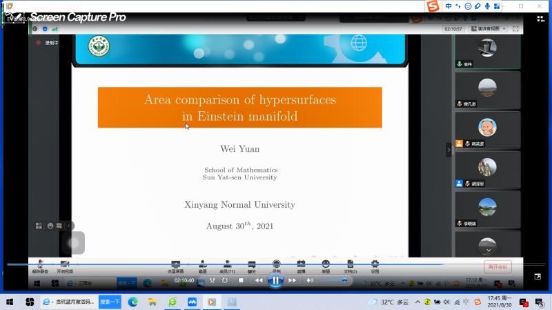 第3场报告由中山大学袁伟教授报告,题目为《Area comparison of hypersurfaces in Einstein manifold》。一个自然的问题是平均曲率是否可以控制超曲面的面积。在报告中,袁伟教授讨论了爱因斯坦流形中超曲面的面积与平均曲率的关系。