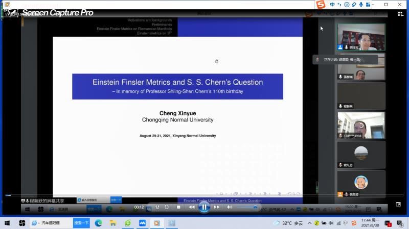 第1场报告由重庆师范大学程新跃教授报告,题目为《Einstein Finsler Metrics and S. S. Chern’s Question》。在报告中,程新跃教授首先在黎曼流形上使用 Killing 形式来构造一类 Finsler 度量,以此找到了刻画爱因斯坦度量的方程。特别地,程新跃教授在