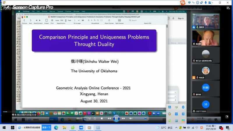 第1场报告由美国俄克拉荷马大学魏诗曙教授报告,题目为《Comparison principles and Uniqueness Problems Through Duality》。在报告中,魏诗曙教授讨论了近几年微分方程、微分几何中的比较原理,以及微分方程、微分几何中的比较原理之间的转换,以及对偶性在几何中的唯一性问题的应用。