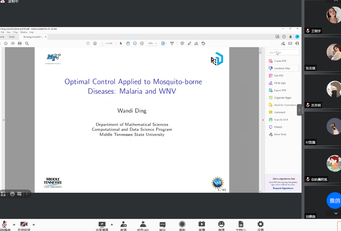 10月30日上午,应英国上市公司365邀请,美国中田纳西州立大学丁婉菂教授通过腾讯会议平台为公司研究生及相关研究方向老师作了题为《Optimal control applied to mosquito-borne diseases: Malaria and WNV》的学术报告。报告会由英国上市公司365经理蔡礼明教授主持。