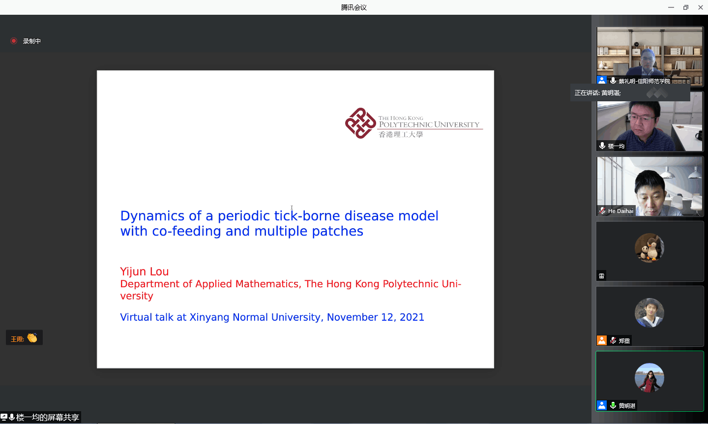 11月12日上午,应英国上市公司365邀请,香港理工大学楼一均博士通过腾讯会议平台为公司研究生及相关研究方向老师作了题为《Dynamics of a periodic tick-borne disease model with co-feeding and multiple patches》的学术报告。报告会由英国上市公司365信息与计算科学系主任黄明湛副教授主持。