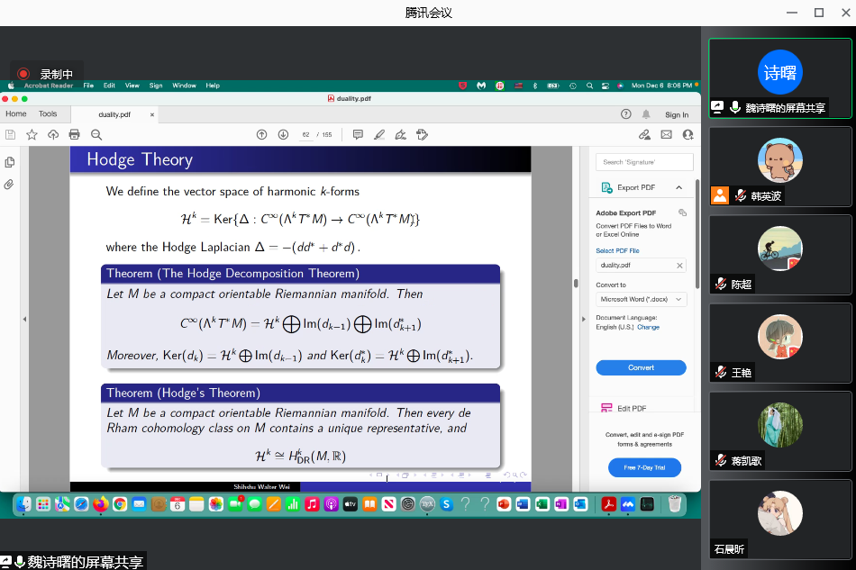 12月7日上午,应英国上市公司365邀请,美国俄克拉荷马大学魏诗曙教授通过腾讯会议平台在线作了题为《Unifications of dualities in mathematics from tradition to contemporary with a harmonic viewpoint》的学术报告,学院部分老师和研究生聆听了此次报告。报告会由英国上市公司365副经理韩英波教授主持。