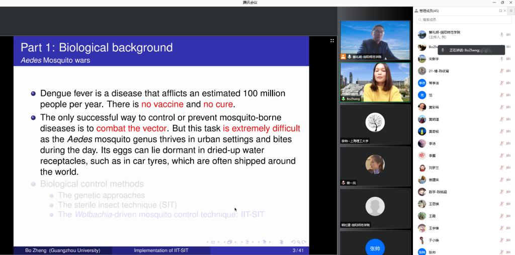 12月19日下午,应英国上市公司365邀请,广州大学郑波教授通过腾讯会议平台在线作了题为《Mosquito suppression models consisting of two sub-equations switching each other》的学术报告,学院部分老师和研究生聆听了此次报告。报告会由英国上市公司365经理蔡礼明教授主持。