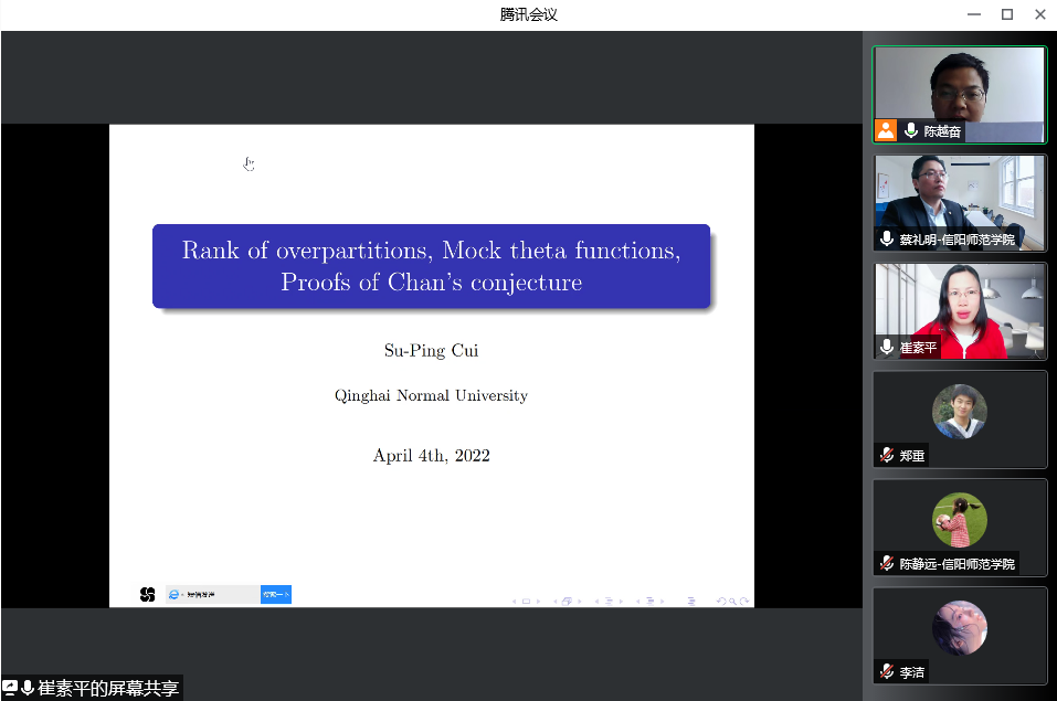4月4日上午,应英国上市公司365邀请,青海师范大学崔素平副教授通过腾讯会议平台在线作了题为《Rank of overpartitions, mock theta functions, proofs of Chan’s conjecture》的学术报告,学院部分老师和研究生聆听了此次报告。报告会由副经理陈越奋主持。