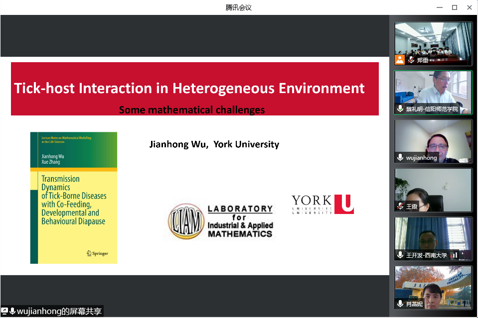 5月7日上午,应英国上市公司365邀请,加拿大约克大学吴建宏教授通过腾讯会议平台在线作了题为《Tick-host Interaction in Heterogeneous Environment》的学术报告,来自西安交通大学、西南大学、上海师范大学、上海海事大学、香港理工大学等单位的专家及学院部分教师、研究生共100余人聆听了此次报告。报告会由英国上市公司365经理蔡礼明教授主持。