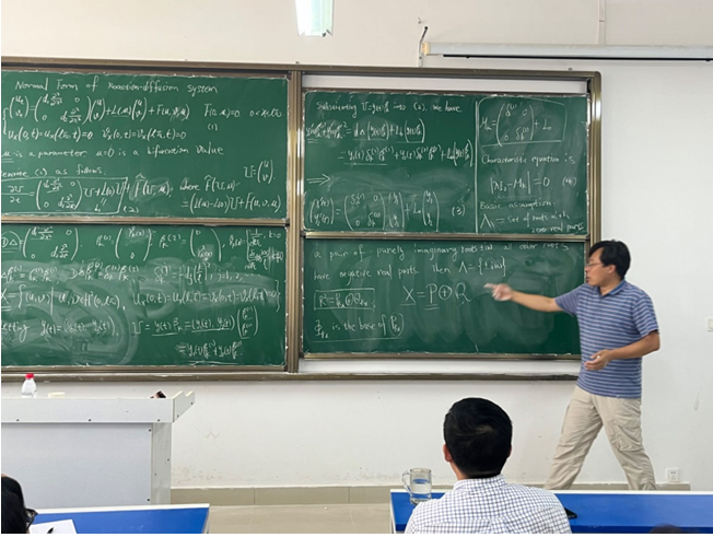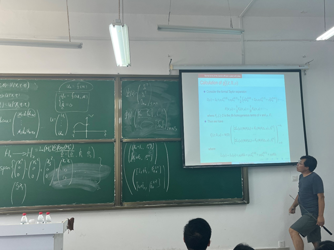 宋永利教授首先给出了偏微分方程Turing、Turing-Hopf、Turing-Turing、Hopf-Hopf分支的定义。接着,宋教授介绍了如何借助于像空间的标准正交基将偏微分方程转化为常微分方程组。针对转化后的常微分方程组,宋教授采用对中心子空间的状态变量及其补空间的状态变量同时做近似恒同变换的方法回避了中心流型的复杂计算进而得到偏微分方程在分支点处的规范型以及动力学分类。