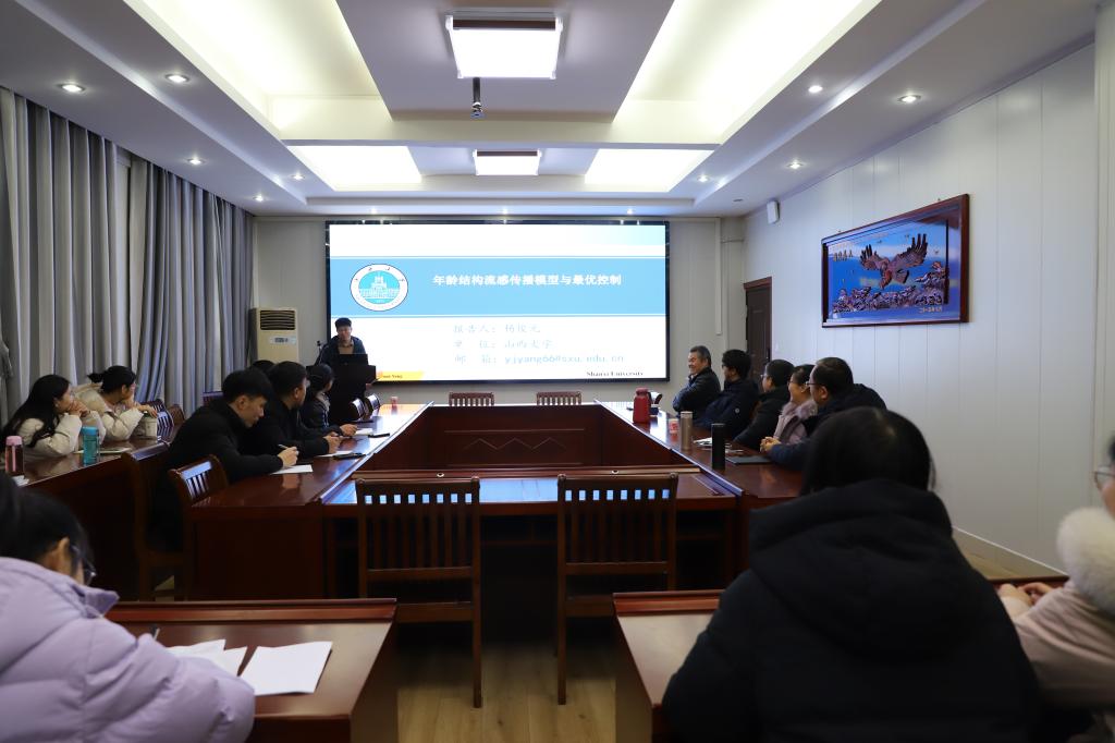12月15日,应英国上市公司365邀请,山西大学杨俊元教授在数学楼315会议室做了题为 “Optimal strategies of the age-specific vaccination and antiviral treatment against influenza” 的学术报告。经理蔡礼明教授、副经理韩英波教授参加了报告会。报告会由英国上市公司365王霞教授主持,部分教师和研究生聆听此次报告会。