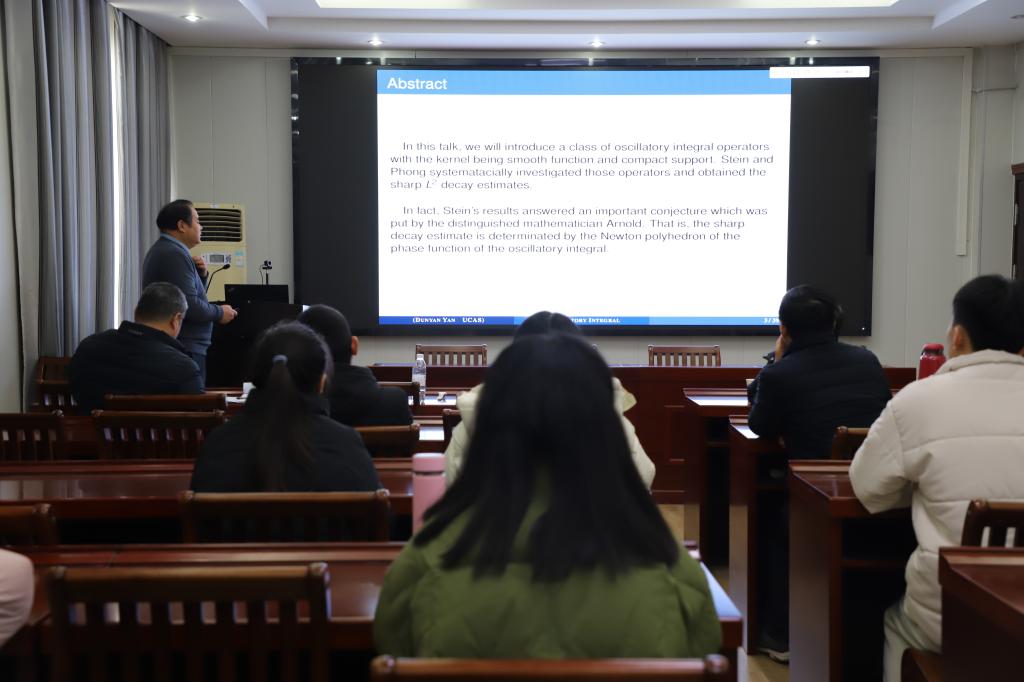 在报告中,燕敦验教授首先回顾了振荡积分和振荡积分算子的最佳衰减估计的一些已有研究成果。然后燕敦验分别给出了带齐次多项式相位和解析相位的振荡积分算子最佳Lp衰减估计,推广了Stein的相关研究成果。接着燕敦验教授给出了广义Fourier变换的一个重要性质。最后燕敦验教介绍了其团队在高维振荡积分算子最佳衰减估计方面的系列研究成果,并深入探讨了研究高维振荡积分算子的技术难点。燕教授的报告内容丰富,思路清晰。报告结束后,燕教授针对师生们提出的问题给出了独到的解答。