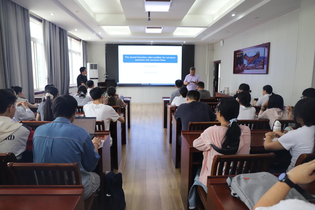 王志张教授首先讲解了图超曲面的相关几何量,然后介绍了k曲率问题的相关背景和已有的一些工作,最后介绍了Hessian 曲率方程和曲率流方程的第二边值问题解的相关的定理及其证明。