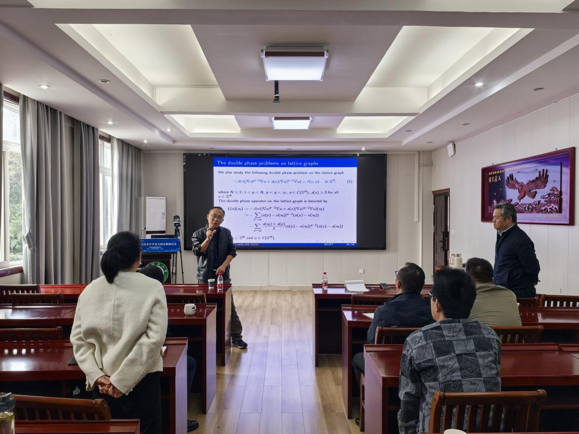 报告中姬超教授以连续空间中的经典偏微分方程为切入点,系统梳理了椭圆方程、热方程、波动方程的核心理论框架与研究脉络。随后,他巧妙衔接至离散空间的研究范畴,详细阐述了从连续到离散的研究范式转换逻辑。在此基础上,姬超教授重点分享了其团队近期在格点图上的对数薛定谔方程以及格点图上的双相问题的最新研究成果。