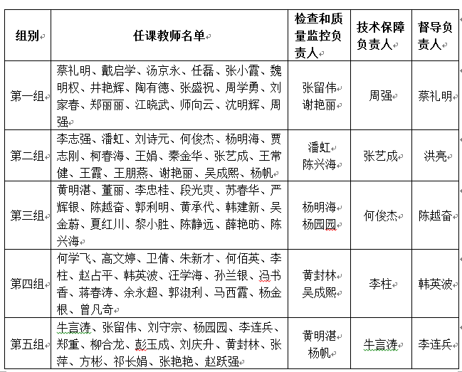 为了强化对线上课程的教学检查和质量监控,确保线上教学不打折扣,成立了线上教学检查和质量监控组,按照任课教师名单分别成立五个组,每组安排专人进行负责,建立“一督双查一保障”模式,具体安排如下:
