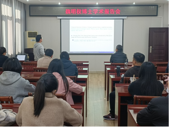 魏明权博士作为第九期论坛活动的主讲人,作了题为“Some new Herz-type spaces and applications”的学术报告。魏博士首先引入了混合Herz空间,给出了混合Herz空间的一些基本性质;然后证明了Hardy-Littlewood极大算子在混合Herz空间上的有界性,接着魏明权博士给出了混合Herz空间上的加权外插定理,并基于此建立了调和分析中一些重要算子在混合Herz空间上的有界性估计。最后,魏博士引入了混合原子Hardy空间,证明了混合原子Hardy空间的对偶为混合中心有界平均振荡空间,并由此给出了Hardy算子及其对偶算子的交换子在混合Herz空间上有界性的若干刻画。报告结束后,魏博士针对师生们提出的问题给出了详细的解答,并与师生就报告内容进行了热烈的讨论。