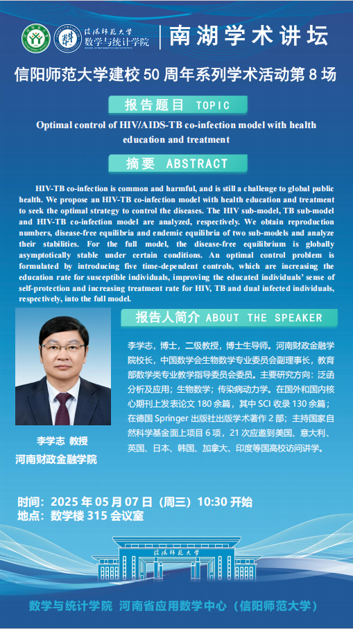 庆建校50周年之南湖讲坛:河南财政金融学院李学志教授——Optimal control of HIV/AIDS-TB co-infection model with health education and treatment