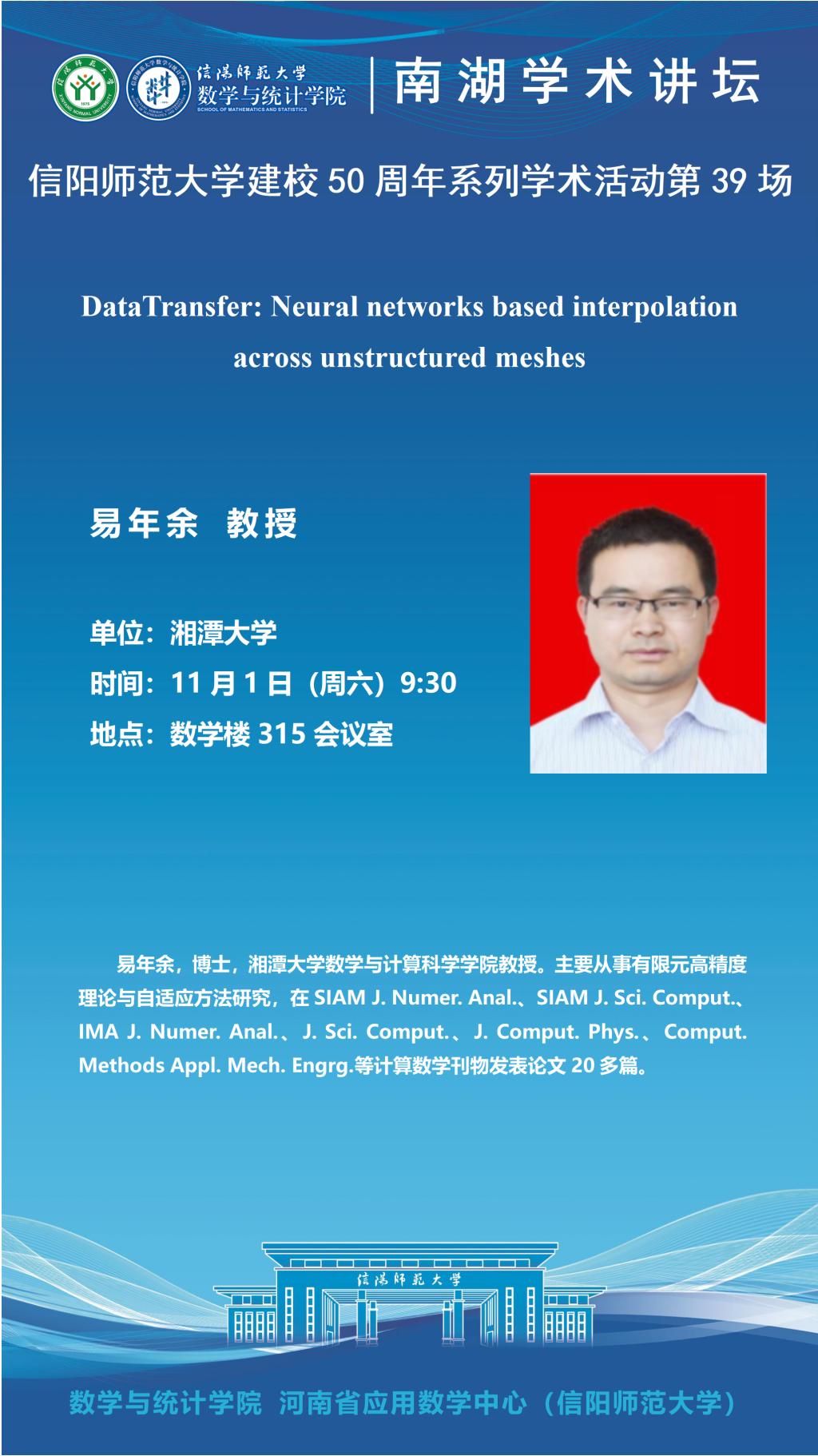 庆建校50周年之南湖讲坛:湘潭大学易年余教授——DataTransfer: Neural networks based interpolation across unstructured meshes